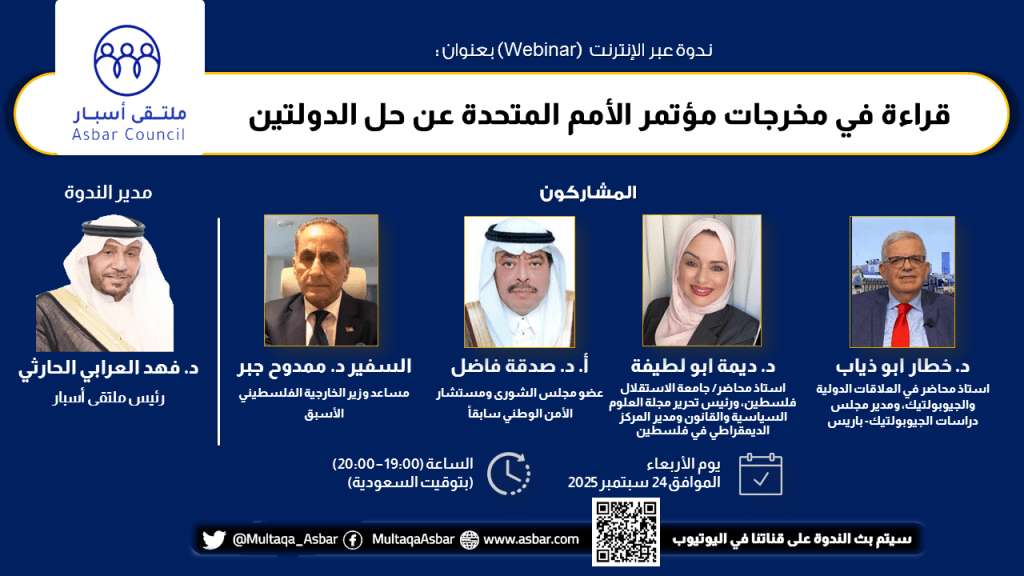 ينظم ملتقى أسبار مساء الأربعاء 24 سبتمبر 2025 عند الساعة السابعة بتوقيت الرياض، ندوة افتراضية بعنوان: “قراءة في مخرجات مؤتمر الأمم المتحدة عن حل الدولتين”.